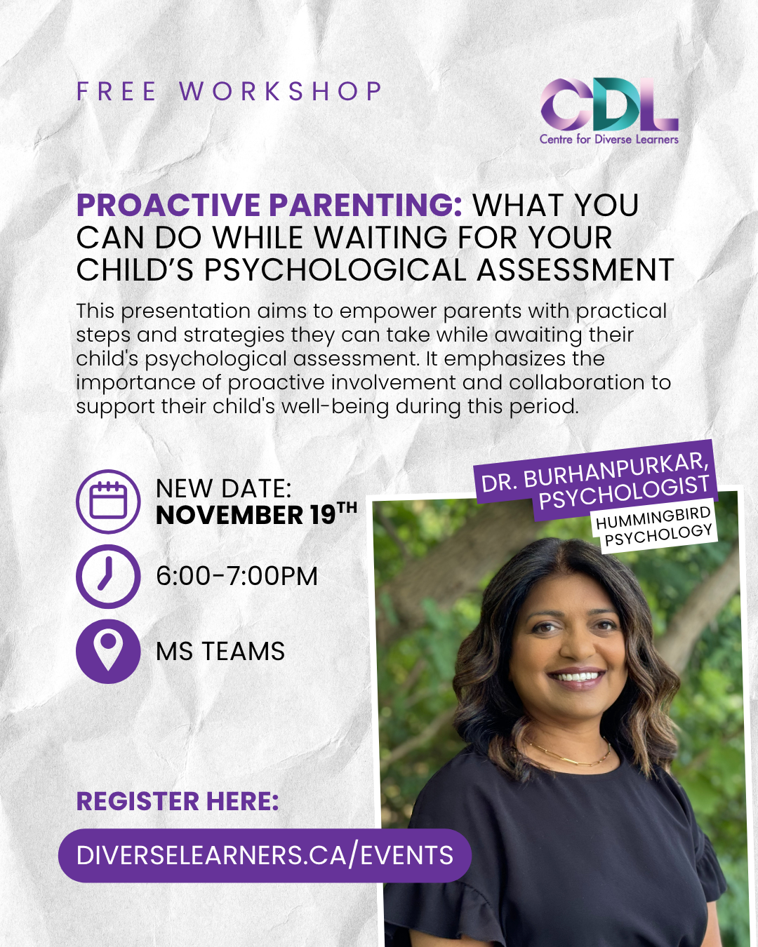 Join Dr. Anita Burhanpurkar, Psychologist at Hummingbird Psychology, for a one-hour virtual session designed to empower parents with practical strategies they can use while waiting for an assessment.